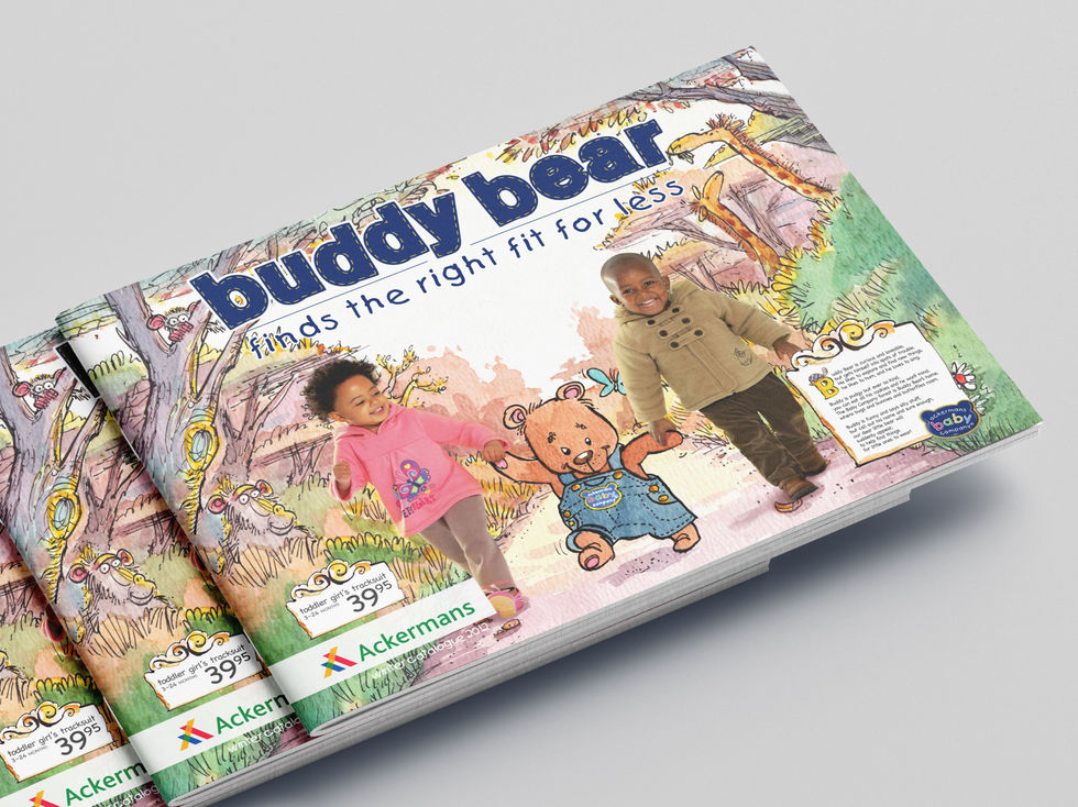 Buddy Bear is a mascot created by Ackermans for their range of child and babywear that, at the time, was due a much needed make-over. We therefore decided to turn their monthly catalogue into a children's storybook. We created short stories based around Buddy Bear and his adventures and hired a watercolour illustrator to bring them to life. The result was something more than a catalogue, a much needed monthly source or new reading material for bedtime.